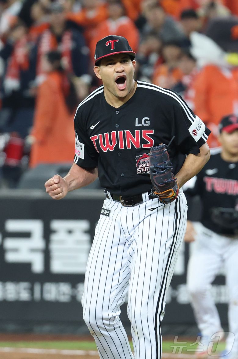 (대전=뉴스1) 김기남 기자 = 30일 대전 한화생명볼파크 열린 프로야구 2025 신한 SOL뱅크 KBO 한국시리즈 4차전 LG 트윈스와 한화 이글스의 경기에서 5회말 2사 2루에서 LG 치리노스가 신민재의 호수비로 위기를 넘기며 환호하고 있다. 2025.10.30/뉴스1