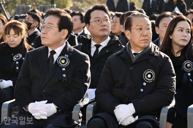 이재명(앞줄 왼쪽) 당시 더불어민주당 대표와 권영세 당시 국민의힘 비대위원장이 1월 국회에서 열린 김수한 전 국회의장 영결식에 나란히 앉아 있다. 고영권 기자 |