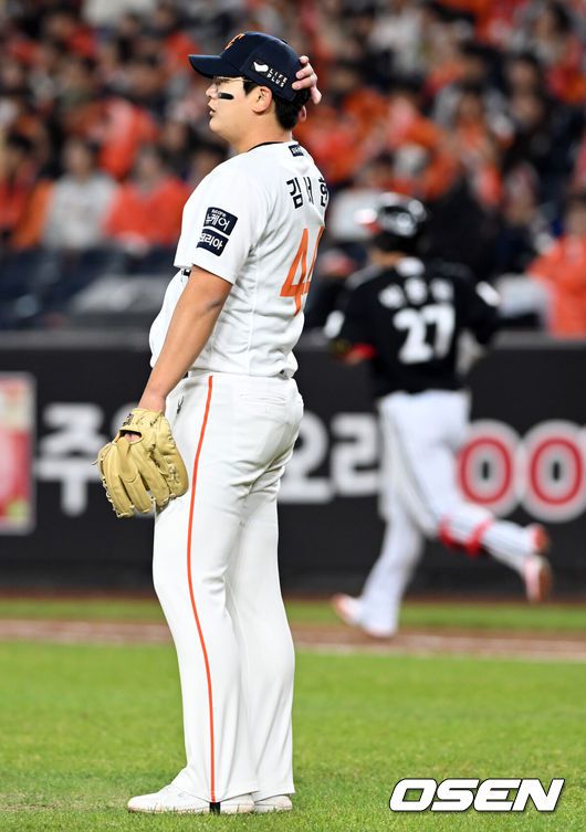 [OSEN=대전, 손용호 기자] 30일 대전 한화생명볼파크에서 2025 신한 SOL Bank KBO리그 포스트시즌 한국시리즈 4차전 한화 이글스와 LG 트윈스의 경기가 열렸다.이날 경기에 한화는 와이스를, LG는 치리노스를 선발투수로 내세웠다. 9회초 무사 김서현이 박동원에 투런 홈런을 맞고 아쉬워하고 있다.  2025.10.30/spjj@osen.co.kr