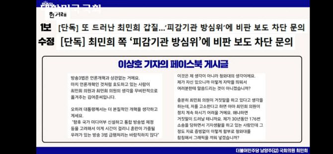 그는 “방심위에 문의한 적도 없고 제재를 요구한 적도 없는데, 마치 제가 방심위를 통해 조치를 요구한 것처럼 기사가 나와 깜짝 놀랐다”며 “확인해보니 비서관이 영상 처리 절차를 묻기 위해 협력관에게 문의한 게 전부였다”고 밝혔다. 이어 “그런데 이를 (한겨레가)‘최민희 갑질’로 표현했다가, 이후 ‘비서관이 문의했다’로 바꾸는 식으로 보도가 수정됐다”고 설명했다.