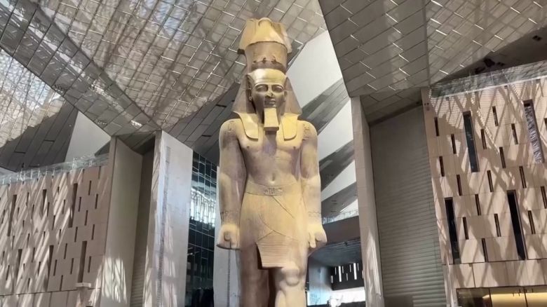 피라미드를 본떠 우뚝 솟은 삼각형 유리 외관을 자랑하는 박물관 입구 아트리움에는 이집트에서 가장 유명한 파라오 중 한 명인 람세스 2세의 화강암 석상이 서 있습니다.