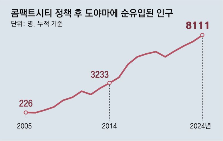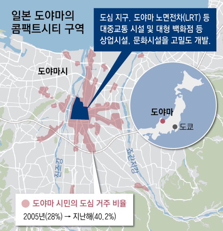 도야마는 2000년 초부터 도심 중심부에 교통, 거주, 상업, 행정 등 각종 기능을 모아 집약적으로 개발했다. 그 결과, 2005년에는 전체 인구의 약 28%만이 도심 및 대중교통 인근 구역에 거주했지만 지난해에는 그 비율이 40.2%로 대폭 늘었다.
