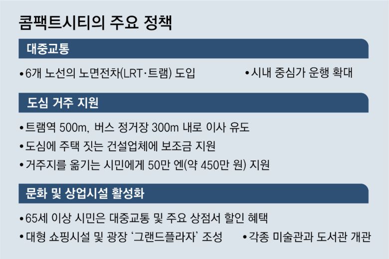 새롭게 정비한 대중교통 노선을 따라 사람이 모여 살도록 유도하는 ‘도심 거주 촉진 프로젝트’도 시행했다. 교외에 흩어져 살던 시민들을 각 트램역 500m 이내, 버스 정거장 300m 이내로 불러들이는 정책이다. 해당 지역에 신규 주택을 짓는 건설사에는 보조금을 줬고, 이곳으로 거주지를 옮기는 시민들에게도 50만 엔(약 450만 원)을 지급했다.