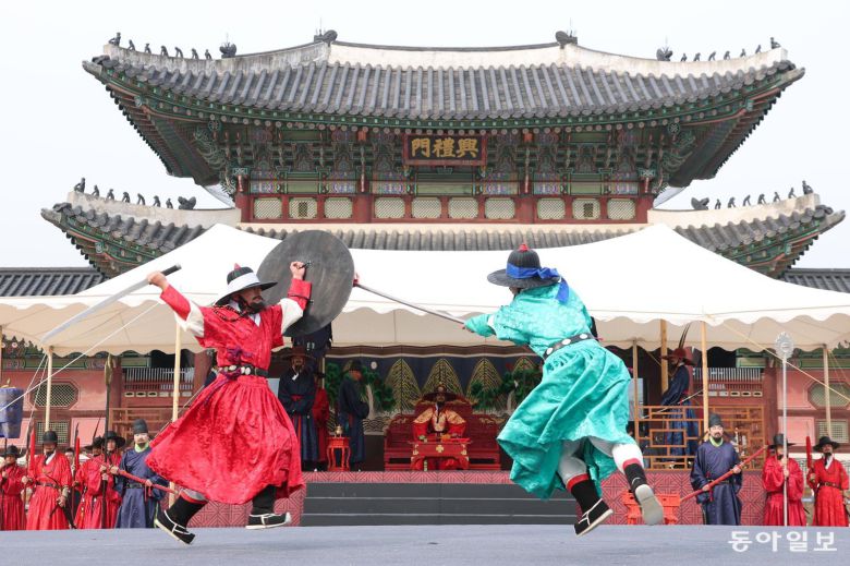 30일 서울 종로구 경복궁 흥례문광장에서 열린 ‘첩종(疊鐘)’ 재현 행사를 하루 앞두고 연기자들이 사열 의식을 시연하고 있다. 첩종은 국왕이 비상사태에 대비해 호위군을 점검하던 조선시대 군사 의식으로, 국가유산청 궁능유적본부는 31일부터 다음 달 2일까지 극 형식으로 재현 행사를 진행한다.
