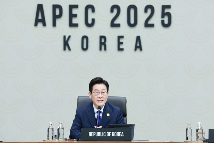 이재명 대통령이 31일 경주화백컨벤션센터(HICO)에서 열린 2025 아시아태평양경제협력체(APEC) 정상회의 제1세션에서 발언하고 있다. 연합뉴스 |