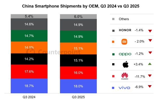 카운터포인트의 마켓 모니터 트래커(잠정) 기준 3분기 중국 시장에서 비보가 점유율 17.9%로 1위를 차지했다. 전년 18.7% 대비 소폭 하락했으나 S30·X200s·Y300·Y500 등 폭넓은 제품 포트폴리오가 실적을 견인했다. 화웨이는 메이트70·퓨라80의 판매가 전작 대비 다소 부진했지만 노바14 시리즈가 견조했고, 하모니OS NEXT 전환에 따른 생태계 제약 과제를 맞았다.