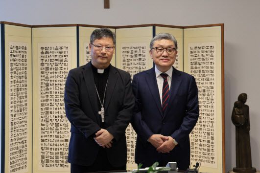 [이데일리 이윤정 기자] 천주교 서울대교구장 정순택 대주교는 31일 서울대교구청 교구장 접견실에서 신형식(세례명 스테파노) 신임 주교황청대사를 접견하고 환담을 나눴다.