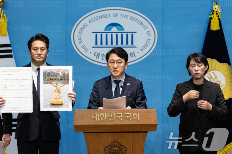 천준호 더불어민주당 의원을 비롯한 국토교통위원들이 29일 서울 여의도 국회 소통관에서 한강버스 사고 은폐 규탄 기자회견을 하고 있다. 2025.10.29/뉴스1 ⓒ News1 이승배 기자 |