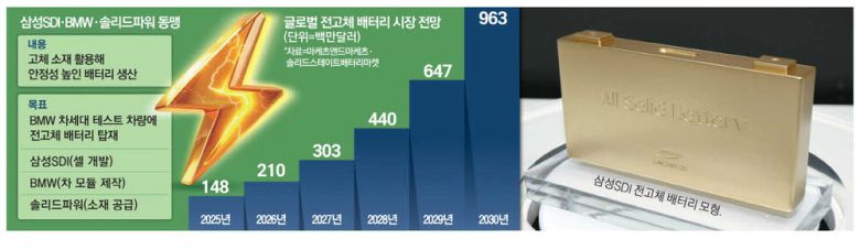 배터리 소재 업체 솔리드파워가 원재료인 고체 전해질을 공급하고, 삼성SDI가 이를 활용해 에너지밀도와 안전성을 높인 전고체 배터리 셀을 만들면, BMW가 이를 바탕으로 배터리 모듈·팩을 개발해 실증하는 방식이다. BMW의 차세대 테스트 차량에 전고체 배터리를 탑재해 실제 성능을 검증하는 게 목표다. 글로벌 배터리 밸류체인을 대표하는 기업들이 손잡고 차세대 배터리 개발에 나선 것이다.