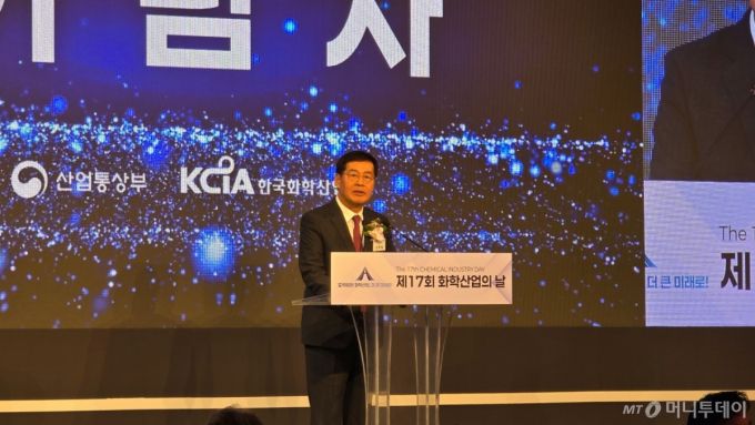 31일 오후 서울 중구 더 플라자 호텔에서 열린 '제17회 화학산업의 날' 행사. 신학철 한국화학산업협회장(LG화학 부회장)이 기념사를 하고 있는 모습./사진=김도균 기자
