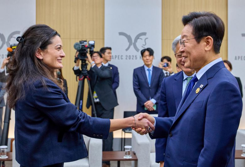 이재명 대통령이 31일 경북 경주 화백 컨벤션센터에서 젠슨 황 엔비디아 대표와 접견에서 황 대표의 딸 매디슨 황과 악수를 하고 있다. 대통령실 제공