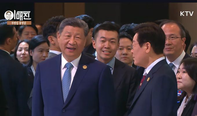 이재명 대통령과 김혜경 여사가 31일 경주 한 호텔에서 열린 아시아태평양경제협력체(APEC) 정상회의 환영 만찬에서 시진핑 중국 국가주석과 나란히 자리하고 있다. [사진=KTV]