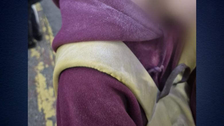 흰색 분말이 옷자락과 가방끈 곳곳에 묻어있습니다.