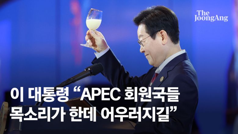 또 “고대 신라에서 만파식적은 세상의 모든 분열과 파란을 잠재우는 평화의 상징이었다”며 “그 화음이 아시아·태평양 지역에 평화와 안정, 번영을 가져올 것으로 확신한다”고 덧붙였다. 이 대통령은 “천년 고도의 정기를 이어받아 APEC의 협력과 성공, 그리고 우리 공동의 미래를 위해 건배하자”며 잔을 들어 올렸다. 건배주로는 농림축산식품부가 선정한 ‘호랑이 유자 생막걸리’가 사용됐다.