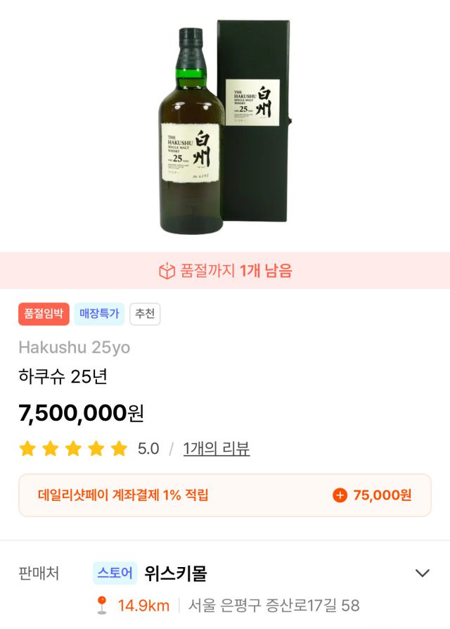 하쿠슈 25년산은 일본 주류업체 산토리가 생산하는 프리미엄 싱글 몰트 위스키로, 셰리의 달콤한 향과 훈연된 나무 향이 어우러지는 복합적인 풍미로 유명하다. 시중가만 700만 원 이상이고, 희소성 탓에 중고 시장에서는 1000만 원대로 거래된다.