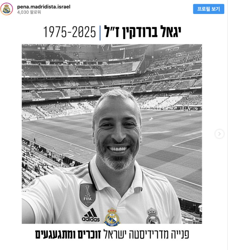 안타까운 사연에 레알 마드리드 팬 클럽이 추모의 뜻을 전했다. 이스라엘 마드리스타는 공식 성명을 통해 “엘클라시코 중 생을 마감한 브로드킨의 안타까운 죽음에 애도를 표한다. 레알 마드리드의 문장을 영혼에 새긴 진정한 팬이었다. 브로드킨의 부재는 시간이 지나도 채워질 수 없을 것이다. 평안히 잠들었길 바란다. 할라 마드리드(Hala Madrid)”라고 알렸다.