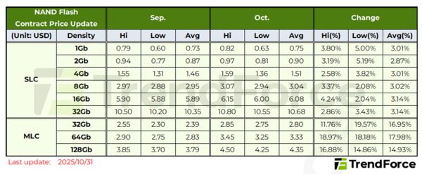 10월 기준 128Gb 16G*8 멀티레벨셀(MLC) 낸드 고정거래가격은 4.35달러다. 전월대비 14.93% 성장했다. 10개월 연속 가격 상승이다. 이 낸드는 메모리카드와 USB에 들어간다.