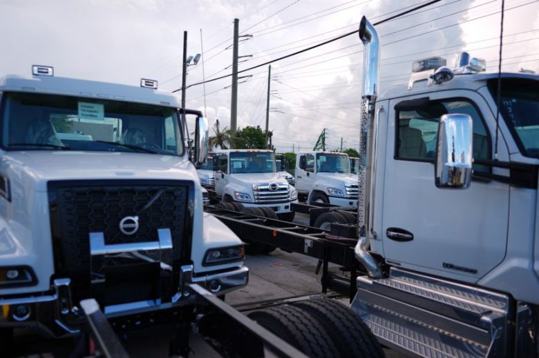 볼보와 히노가 제조한 트럭들이 미국 마이애미의 한 트럭 딜러십에 진열돼 있다. [AP] |