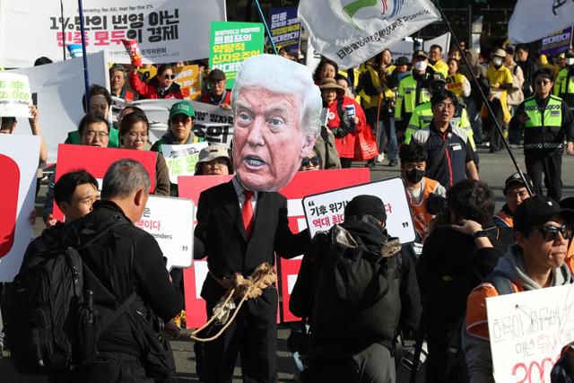 '2025 아시아태평양경제협력체(APEC) 정상회의' 마지막 날인 1일 경북 경주 시내 곳곳에서는 '반(反) APEC·트럼프 시위가 이어졌다. 자유무역과 시장 개방이 확산하면서 사회적 취약 계층에 대한 권리가 계속해서 침해되고 있다는 취지다. 이날 21개국 정상이 채택한 경주선언을 비판하는 목소리도 이어졌다.