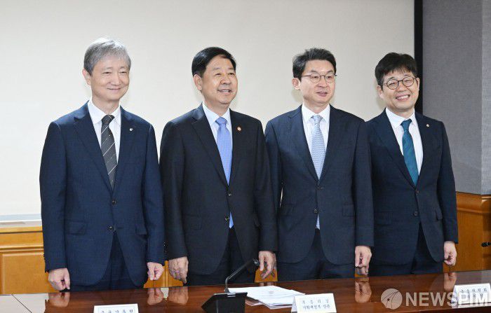 [서울=뉴스핌] 구윤철 부총리 겸 기획재정부 장관이 18일 서울 중구 은행회관에서 열린 확대 거시경제금융회의에서 참석자들과 기념촬영을 하고 있다. 왼쪽부터 이찬진 금융원장, 구윤철 부총리, 이억원 금융위원장, 유상대 한국은행 부총재. [사진=기획재정부] 2025.09.18 photo@newspim.com |