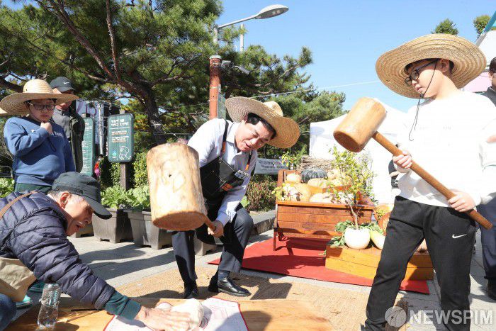 [서울=뉴스핌] 양윤모 기자 = 「일상, 도시농업」을 주제로 한 ‘제8회 관악 도시농업축제’가 1일 서울 관악구 낙성대공원에서 개최됐다. 이날 행사에는 떡메치기 외에도 벼훑기, 양봉 프로그램, 대장간 체험 등 다채로운 농업 체험이 마련되어 주민들의 큰 호응을 얻었다. 특히, 박준희 관악구청장이 직접 도시농부로 변신해 아이들과 떡메를 함께 치며, 도시와 농업의 소중한 연결고리를 강조했다. [사진=관악구청] 2025.11.01 yym58@newspim.com