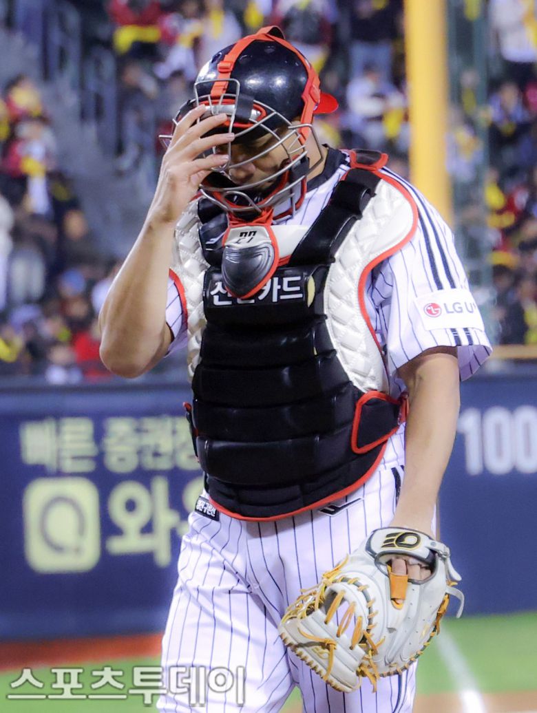 [스포츠투데이 안성후 기자] LG트윈스의 2025 한국시리즈 우승 세리머니가 1일 오후 서울 잠실야구장에서 열렸다. 이날 팬들을 위한 이벤트 경기에서 포수로 나선 LG 투수 요니 치리노스가 고개를 떨구고 있다. 2025.11.01 [스포츠투데이 안성후 기자 sports@stoo.com]이 기사의 카테고리는 언론사의 분류를 따릅니다.0공유하기
