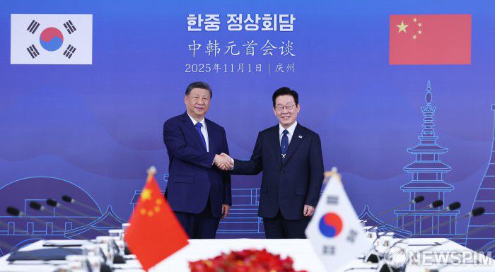 [서울=뉴스핌] 이재명 대통령과 시진핑 중국 국가주석이 1일 오후 경북 경주시 국립경주박물관에서 한중 정상회담을 하고 있다. [사진=APEC 2025 KOREA & 연합뉴스] 2025.11.01 photo@newspim.com |