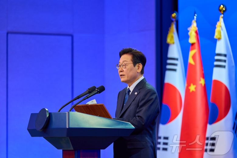 이재명 대통령이 지난 1일 경북 경주시 소노캄 그랜드볼룸에서 열린 한중 국빈만찬에서 인사말을 하고 있다. (대통령실 제공. 재판매 및 DB 금지) 2025.11.2/뉴스1 ⓒ News1 이재명 기자