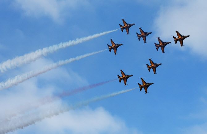 지난달 19일 경기도 성남시 서울공항에서 열린 ‘서울 국제항공우주 및 방위산업 전시회(ADEX)’에서 공군 특수비행팀 블랙이글스가 에어쇼를 선보이고 있다. (사진=연합뉴스)