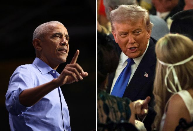 왼쪽은 1일(현지시간) 뉴저지 뉴어크에서 열린 민주당 주지사 후보 마이키 셰릴의 유세 현장에서 연설 중인 버락 오바마 전 미국 대통령의 모습, 오른쪽은 10월 31일 플로리다 팜비치 마러라고 별장에서 열린 핼러윈 파티에서 참석자들과 대화하는 도널드 트럼프 미국 대통령의 모습. 로이터·AFP 연합뉴스