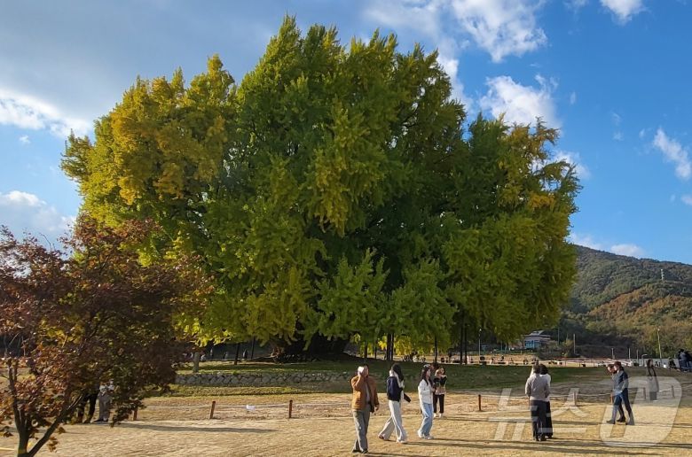 2일 강원도 원주시 문막읍 반계리 은행나무광장에서 열린 '2025 반계리 은행나무 축제'를 찾은 관광객 등이 노랗게 물들어 가고 있는 은행나무를 구경하고 있다. 국내 최고 수령(1318년 추정)인 반계리 은행나무는 천연기념물 제167호로, 높이 32m·둘레 16.27m 규모를 자랑한다. 올해 반계리 은행나무의 단풍은 평년보다는 절정 시기가 늦은 편이지만, 이날 축제는 예년에 버금가는 수준의 인파가 몰리면서 성황을 이루고 있다. 2025.11.2뉴스1 ⓒ News1 신관호 기자