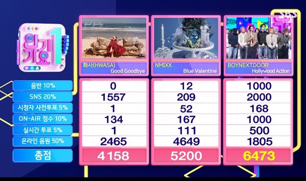 1위 후보로 맞붙은 화사의 '굿 굿바이'(Good Goodbye)는 총점 4158점을 받아 3위, 엔믹스의 '블루 발렌타인'(Blue Valentine)은 총점 5200점으로 2위에 머물렀다.