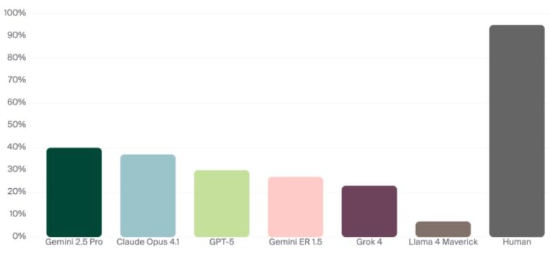 가장 높은 평가를 받은 제미나이 2.5 프로의 임무 완료율도 40%에 그쳤다. 그 뒤를 클로드 오퍼스4.1(37%), GPT-5(30%), 제미나이 ER 1.5(27%), 그록4(23%) 등이 이었다. 메타의 라마4 매버릭은 7%의 완료율을 기록했다.