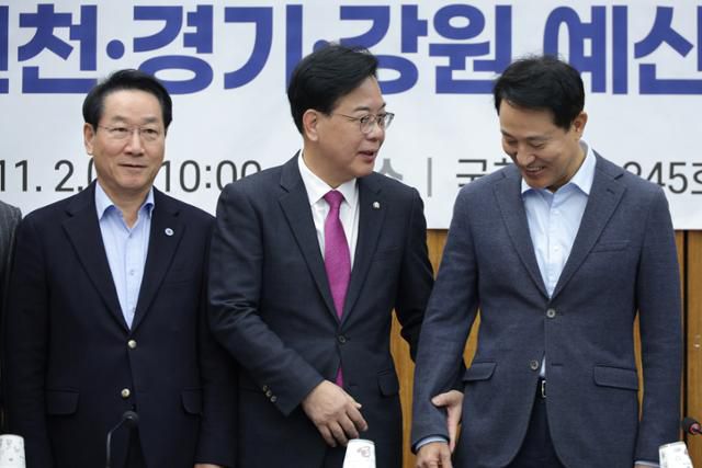 송언석(가운데) 국민의힘 원내대표와 오세훈(오른쪽) 서울시장, 유정복 인천시장이 2일 국회 국민의힘-서울·인천·경기·강원 예산정책협의회에서 만나 대화하고 있다. 뉴스1 |