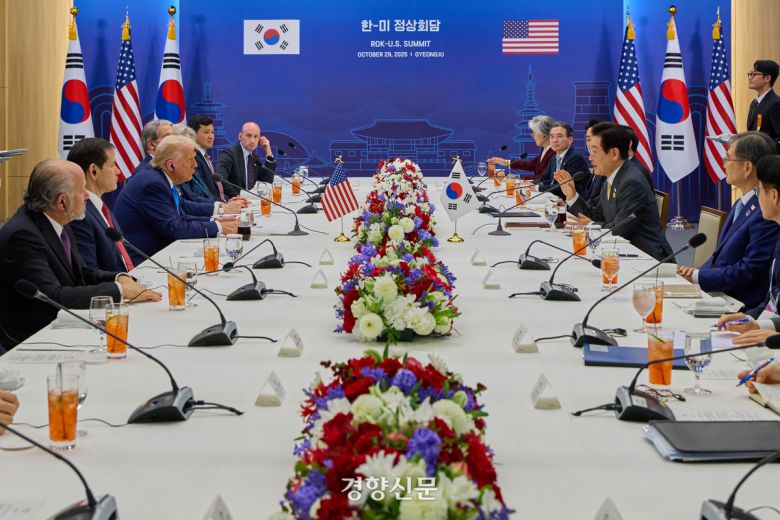 이재명 대통령과 트럼프 미 대통령이 지난달 29일 경북 경주시 국립경주박물관에서 확대오찬회담을 하고 있다. 대통령실 제공