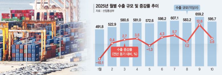 지난 1일 산업통상부가 내놓은 '2025년 10월 수출입 동향'에 따르면 10월 수출은 전년 동월보다 3.6% 증가한 595억7000만달러, 수입은 1.5% 줄어든 535억2000만달러를 기록했다. 이에 따라 무역수지는 60억6000만달러 흑자를 나타냈다.
