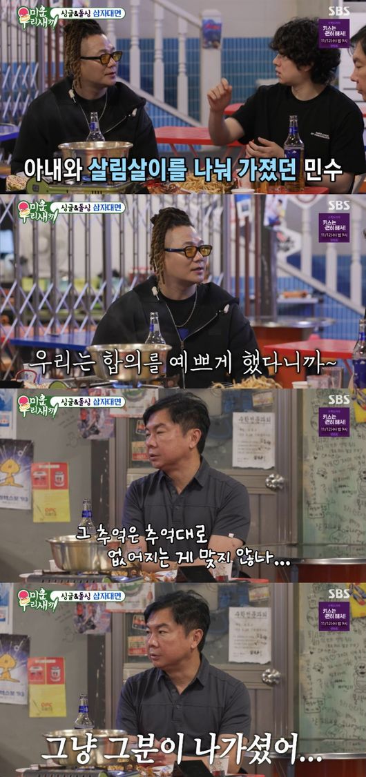 이날 김희철은 ‘이혼 1년차’ 윤민수에 “형은 재산 많이 나눴냐”라고 물었다. 윤민수는 “그렇지. 근데 우리는 합의를 잘해서”라고 답했다.