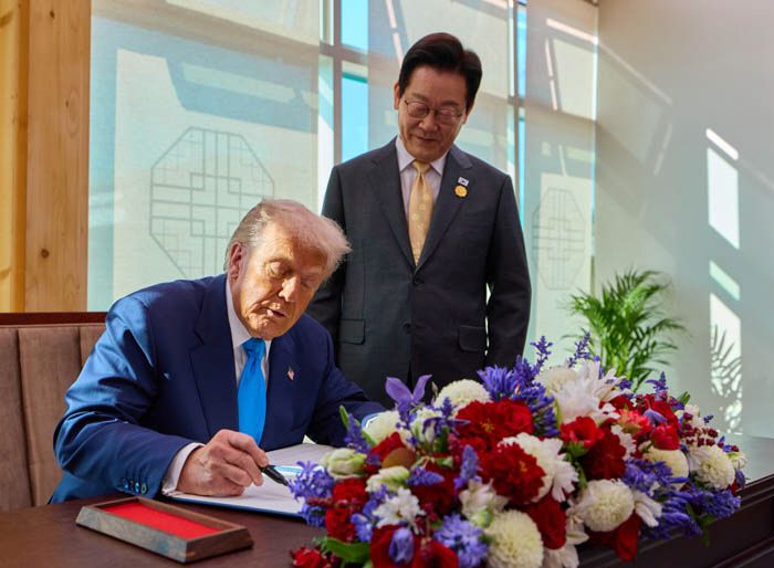 방명록 쓰는 트럼프 이재명 대통령이 지난달 29일 한·미 정상회담이 열린 경북 경주박물관에서 도널드 트럼프 미국 대통령이 방명록을 작성하는 모습을 바라보고 있다. 대통령실 제공