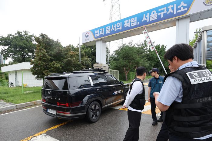 경기도 의왕시 서울구치소 앞에서 법무부 차량이 구치소로 향하는 모습. [연합뉴스]