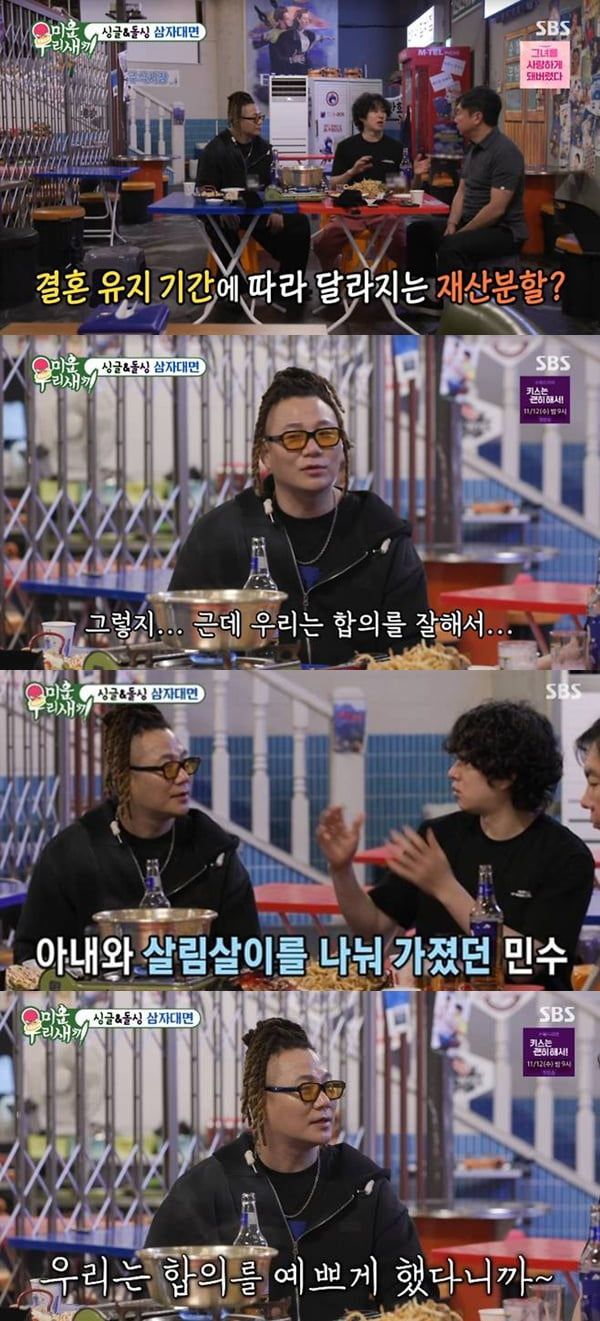 이날 김희철은 결혼 유지 기간에 따른 재산 분할에 대해 궁금해했다. 윤민수는 재산을 많이 나눴냐는 질문에 "그렇다. 근데 재산 분할이라기보다는 각자 필요한 것을 나눴다"며 "우리는 합의를 예쁘게 했다. 소송 같은 것도 없었다. 조용하고 깔끔하게 마무리 됐다"고 밝혔다. 앞서 윤민수는 이혼을 준비하며 80평대 자가와 3년 전 약 40억원에 매입한 서울 상암동 건물을 매각한 바 있다.