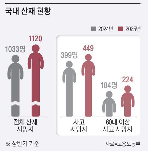 지난 상반기 국내 산업재해(이하 산재)로 1120명이 사망했으며, 이 중 절반 가까이가 건설업 현장에서 발생했다. 중대재해처벌법 시행과 기술 발전으로 인한 안전 예방 시스템의 확산에도 산재 사망자 수는 전년 동기 대비 87명 늘어나며 역행하고 있다. 특히 60대 이상 고령 근로자 사망자가 40명 증가하는 등 고령 근로자를 위한 맞춤형 안전 예방 시스템 구축이 시급하다는 지적이 나온다.