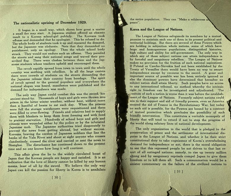 KOREA MUST BE FREE 책자 30쪽에는 “수백 명의 학생이 경찰에 의해 부상을 입었다”는 광주학생독립운동의 전개 과정이 담겼다. 31쪽에는 “세계 평화를 유지하기 위해 설립된 국제연맹이 한국의 독립 요구를 인정해야 한다”는 내용의 호소문이 담겨 있다.