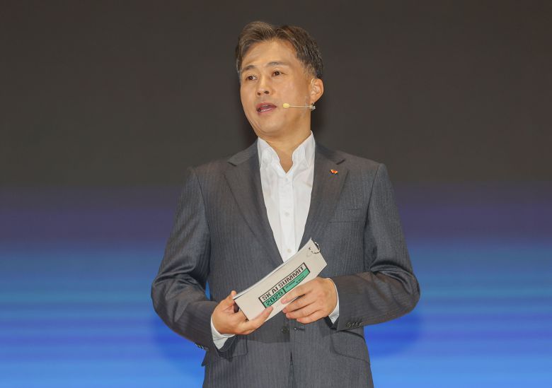 곽노정 SK하이닉스 사장이 3일 서울 강남구 코엑스 오디토리움에서 열린 'SK AI 서밋 2025'에서 AI 메모리를 주제로 발표하고 있다./연합뉴스 |
