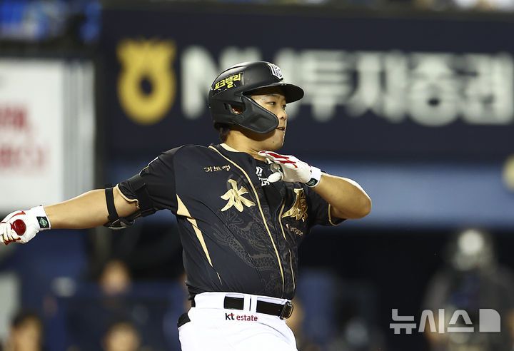 [서울=뉴시스] 김근수 기자 = 11일 서울 송파구 잠실야구장에서 열린 2025 KBO리그 KT 위즈 대 LG 트윈스의 경기, 7회초 1사 주자 1,3루 상황에서 KT 강백호가 1타점 적시타를 치고 있다. 2025.09.11. ks@newsis.com