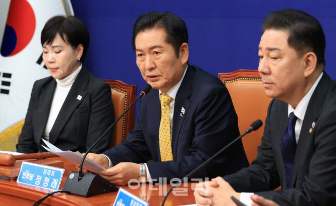 정청래 더불어민주당 대표가 3일 오전 국회에서 열린 최고위원회의에서 모두발언을 하고 있다. 사진 우측은 김병기 원내대표. (사진=노진환 기자) |