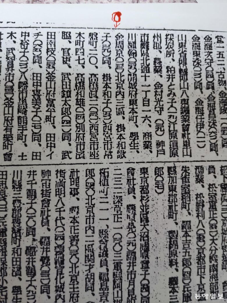 1943년 일본 후쿠오카 해역에서 침몰한 곤론마루 승선자 명단에서 발견된 ‘김주경(金周京)’의 이름. 사진 중앙 빨간색 표시 부분 아래쪽. 김문길 한일문화연구소장 제공