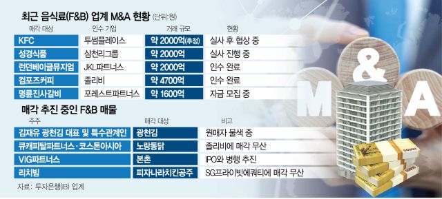 투자은행(IB) 업계에서는 ‘K-푸드’ 열기 속 이번 KFC딜을 계기로 F&B 인수합병(M&A) 시장이 다시 달아오를지 기대하는 분위기다. 3일 업계에 따르면 최근 국내 F&B 시장에 굵직한 매물들이 잇따라 나오고 있다. '줄 서서 먹는 베이글'로 잘 알려진 런던베이글뮤지엄이 최근 사모펀드 JKL파트너스에 약 2000억 원에 팔리면서 화제가 된 바 있다. 조미김 제조업체 성경식품은 삼천리그룹이 우선협상대상자로 선정돼 실사를 진행 중이다. 김 시장의 또 다른 강자인 광천김도 경영권 매각을 공식화하고 주관사 선정을 마쳤다. 두 회사 모두 미국과 유럽 등 해외 수출 비중이 높고, 제조와 포장 등 생산 체계를 갖추고 있어 인수 후보들의 관심이 크다.
