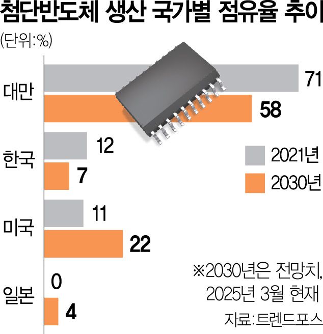 이날 트럼프 대통령은 “2년 안에 우리는 반도체 시장의 40~50%를 차지하게 될 것”이라며 “대기업이 관세 때문에 대만을 떠나 미국으로 들어오고 있다”고 강조했다. 올 3월 시장조사 업체 트렌드포스에 따르면 TSMC가 미국 투자금을 1650억 달러로 늘린 덕분에 미국은 전 세계 첨단 반도체 생산 점유율이 2021년 11%에서 2030년 22%로 상승할 것으로 전망됐다. 최근 하워드 러트닉 미 상무장관이 대만에 반도체 생산의 절반을 미국으로 이전하라는 취지로 압박을 가했는데 트럼프 대통령의 발언도 이의 연장선으로 풀이된다. 대만 TSMC가 미국에서 반도체 절반을 생산하면 미국의 점유율도 그만큼 올라갈 수밖에 없다. 하지만 대만 정부가 미국의 이 같은 요구를 거부하고 있는 만큼 실현 가능성은 불투명하다.