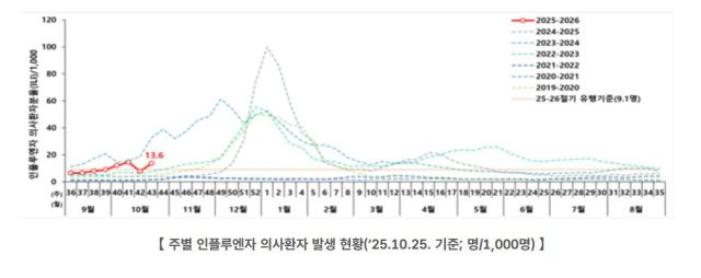 3일 질병관리청에 따르면 지난 10월17일부터 '2025-2026절기 인플루엔자 유행주의보'가 발령됐다. 의원급 의료기관의 표본감시 결과, 10월 셋째 주(43주차) 인플루엔자 의사환자 분율은 외래환자 1000명당 13.6명으로 지난해 같은 기간(3.9명)과 비교해 3배를 넘었다.