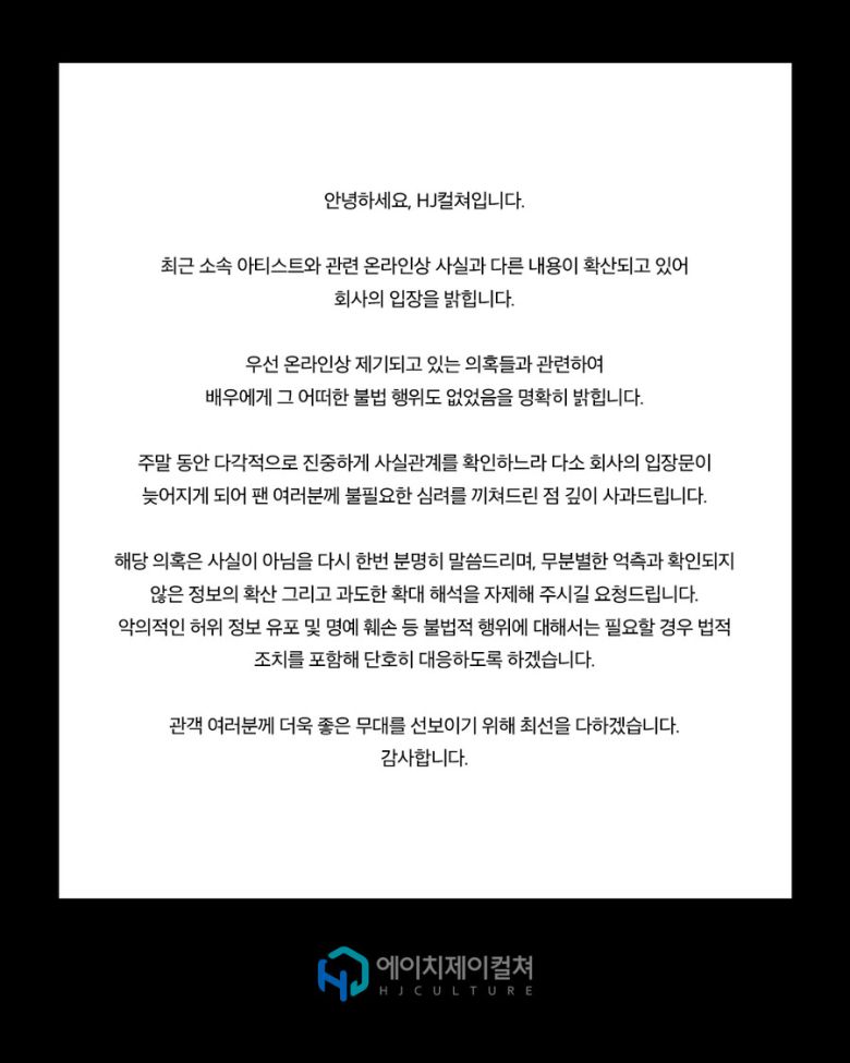 우선 온라인상 제기되고 있는 의혹들과 관련하여 배우에게 그 어떠한 불법 행위도 없었음을 명확히 밝힙니다.